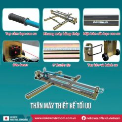 Ngoài ra, các chi tiết khác trên thân máy cũng được hãng đầu tư kỹ lưỡng như: Mặt bàn cắt bọc cao su chống trơn trượt, giúp tăng tính an toàn khi thao tác. Trang bị 3 chân đỡ có thước đo dài 55cm, hỗ trợ người dùng đo đạc chính xác. Đèn laser hỗ trợ căn chỉnh đường cắt rõ ràng, chính xác ngay cả trong điều kiện thiếu sáng. Ngoài ra, máy còn có tay kéo cùng 2 bánh xe, máy cắt gạch bàn đẩy tay Nakawa NK-CGB1000 có thể dễ dàng di chuyển mà không hề tốn sức.