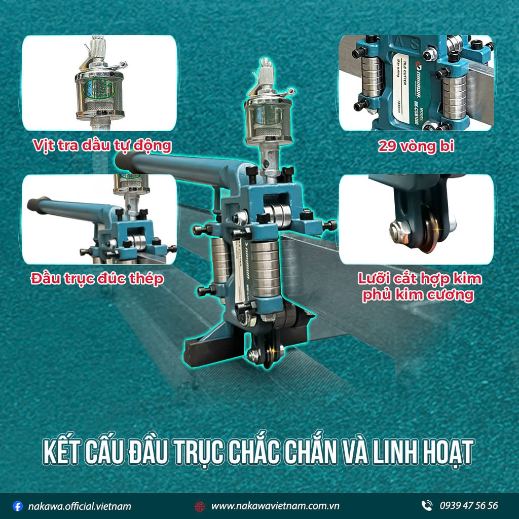 Sở hữu kết cấu đầu trục chắc chắn và bền bỉ. Đầu trục lăn được đúc thép nguyên khối liền với tay cầm, tăng độ bền và sự ổn định khi vận hành. Tay cầm bọc cao su tăng ma sát, chống trơn trượt khi sử dụng. Thiết kế đi kèm 29 vòng bi trên đầu trục giúp giảm ma sát, đảm bảo tốc độ cắt ổn định ngay cả khi hoạt động liên tục. Chân đế đầu trục bọc cao su bảo vệ mặt gạch, chống trầy xước trong quá trình cắt. Lưỡi cắt hợp kim phủ siêu sắc bén cho đường cắt mịn đẹp, đáp ứng các yêu cầu cao về độ chính xác và thẩm mỹ trong thi công. Máy còn được trang bị hệ thống tra dầu tự động ở đầu trục, giúp bôi trơn liên tục, tăng độ mượt mà khi vận hành.